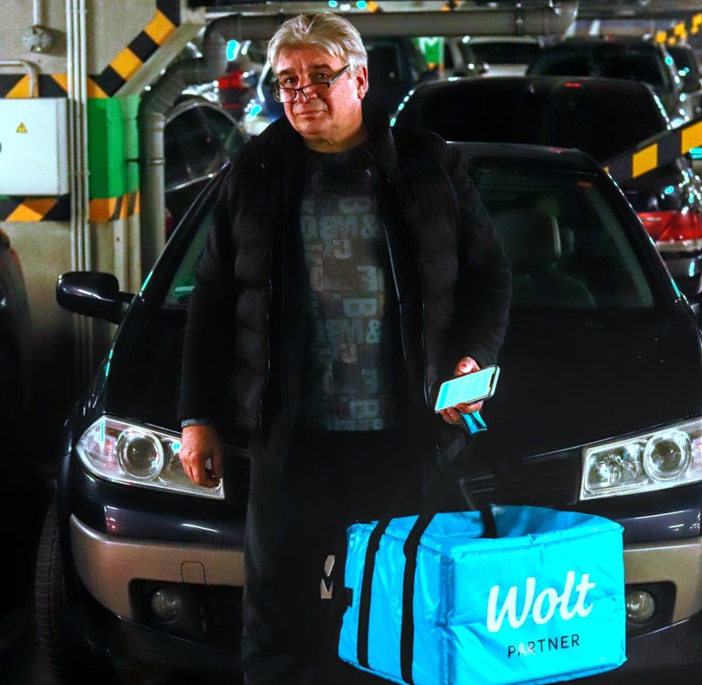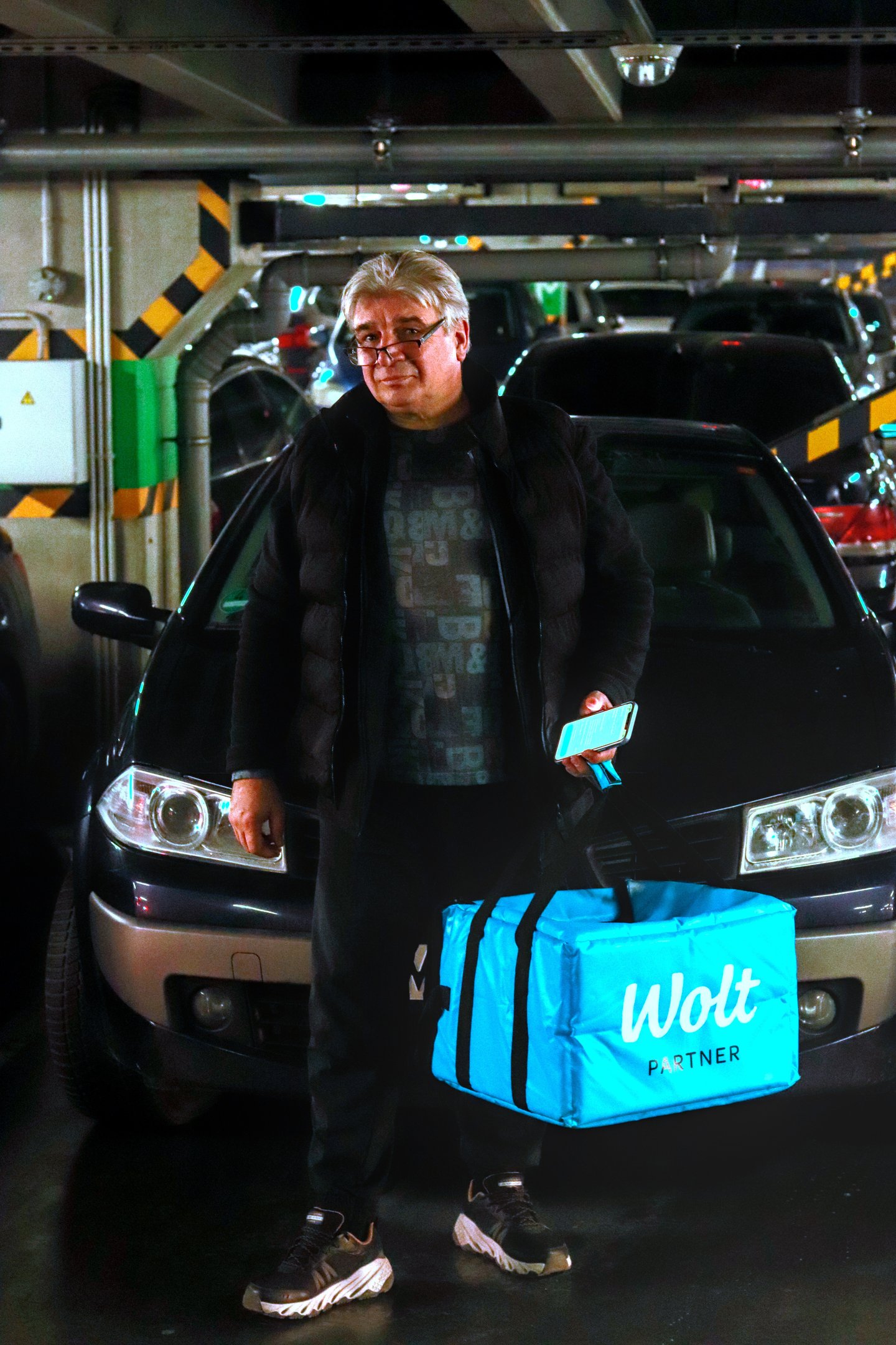 Gintaras Rukšėnas: Nuo 2018 metų, kai tik atsirado Kaune Wolt. Kaip tik atsidarinėjom parduotuvę su žmona, reikėjo pinigų. Kolega restorane sakė: „einam pasižiūrėti, kas čia per naujadaras toks“. Pradžioj nebuvom patenkinti – tarifai tragiški, uždirbti neįmanoma. Papildomai dirbau 1424, vežiojau žmones. Paskui po biški pakilo tarifai, nu ir apie 2020 jau mes gerai uždirbdavom. Bet ariau kiekvieną mielą dieną, pradėdavau prieš 10 ryte, grįždavau po vidurnakčio. Tai du su puse etato iš esmės. Aišku, gaudavai po tris tūkstančius per mėnesį ir karalius jausdavaisi. Tai dirbdavau daug daugiau nei dabar. Nu bet ir metų jau šešiasdešimt turiu.