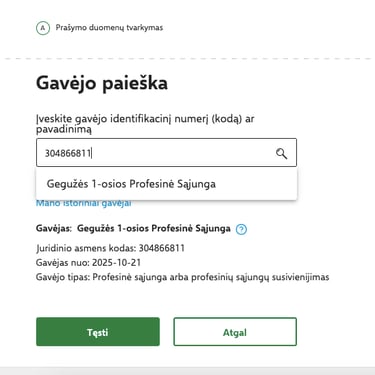 Įrašykite mūsų organizacijos kodą 304866811 arba pavadinimą Gegužės 1-osios profesinė sąjunga. Radę organizaciją, spauskite „Tęsti‟.