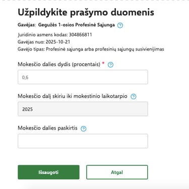 Langelyje „Mokesčio dalies dydis‟ įrašykite „0,6‟ ir pasirinkite iki kurių metų skiriate mokesčio dalį (galite skirti keleriems metams į priekį). Mokesčio paskirties dalį galite palikti tuščią. Spauskite „Išsaugoti‟.
