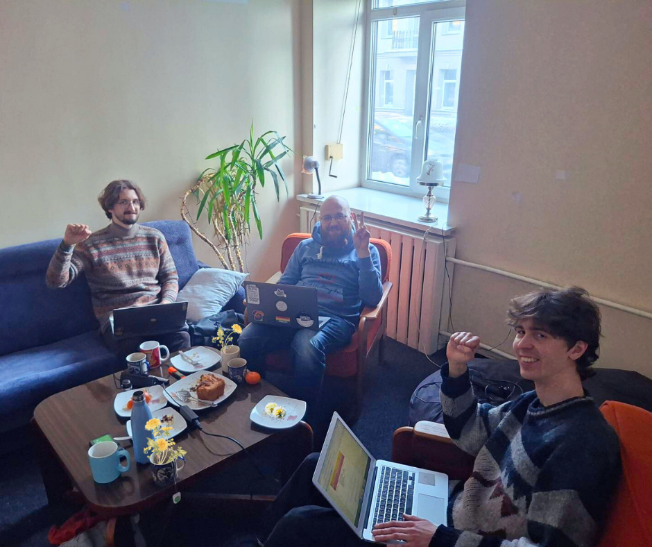 На этой неделе сотрудники G1PS Томас Марцинкевичюс-Баронас (председатель), Рокас Линкевичюс (внутренние коммуникации) и Эмиль Стародубов (общественные коммуникации и координация консультаций по трудовому праву) сели за стол серьезно поговорить.